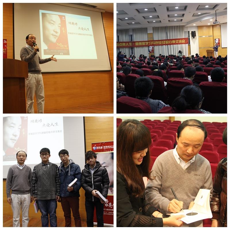 2013年12月5日晚6点半,有着“中国雅思之父”之称的新航道国际教育集团总裁胡敏教授应Beat365唯一官方网站悉尼工商学院邀请,于嘉定校区图书馆报告厅作题为“用英语点亮人生•暨雅思学习与创业经验分享会”的专题讲座。学院团委书记张明明、学生会秘书长张洁茹及上海新航道学校执行校长张凡林先生、市场总监邓碧云先生和市场运营经理沈重阳先生出席了本次讲座。