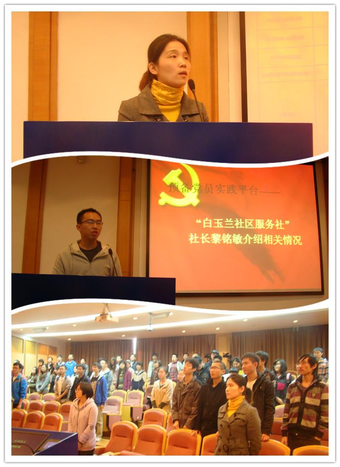 “白玉兰社区服务社”社长黎铭敏介绍了预备党员实践平台的相关情况,他介绍到,“入党就是比别人做更多的事,吃更多的苦,做更多的牺牲,预备党员可以通过走进社区,参加社区工作,增加对党员实践工作的认识,为人民服务”,他的发言引起了在场各位的热烈掌声。