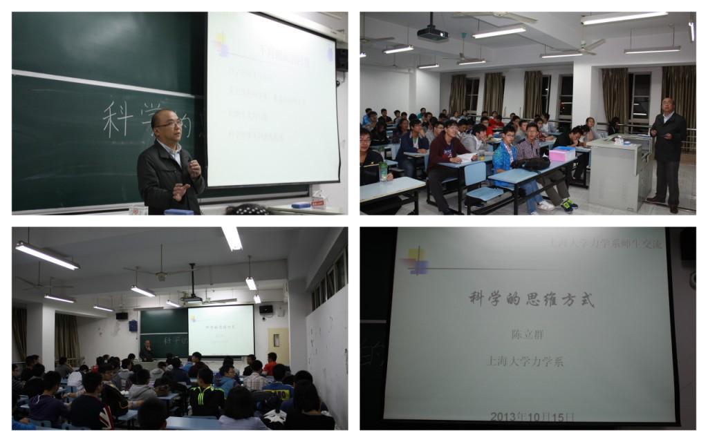 10月15号晚上6点,“力学教授讲坛”第3讲报告会在Beat365唯一官方网站本部A303举行。Beat365唯一官方网站力学系陈立群教授应邀为部分社区学院2013级新生和力学系本科生做了题为 “科学的思维方法”的科技前沿报告。