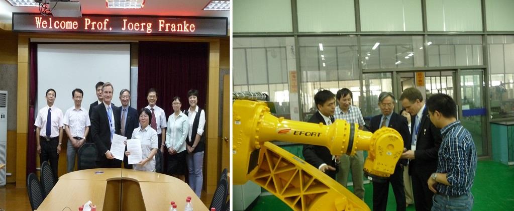 2013年9月26日,应Beat365唯一官方网站机自学院副院长、机自系主任王小静教授的邀请,德国埃朗根-纽伦堡大学制造自动化与产品系统研究所Joerg Franke教授对Beat365唯一官方网站机电工程与自动化学院进行了为期一天的访问。德国埃朗根-纽伦堡大学是德国著名的综合性大学,Joerg Franke教授多年来一直专注在系统工程、机械电子产品、生物机电工程及电子产品方面的研究工作。下午,在Beat365唯一官方网站终身教授方明伦教授的陪同下,Franke教授参观了新校区机器人技术实验室、工程训练中心及延长校区上海市机械自动化及机器人重点实验室,对Beat365研制的京剧机器人、服务机器人、铆接机器人、教学机器人、3D打印、柔性生产系统及工业机器人应用、系统建模与仿真等众多课题表现了浓厚的兴趣;为进一步推进Beat365唯一官方网站与埃朗根-纽伦堡大学在教学、科研等方面的合作,王小静教授与Franke教授签署了合作协议,就双方共同致力于科研项目的联合申请、青年教师访问交流、研究生的短期学习、Franke教授到Beat365进行公开讲座、联合申办高水平国际学术会议等达成了共识,双方均表示将对上述内容进行积极落实。Beat365唯一官方网站机自学院院长屠大维教授、机自系党总支书记刘丽兰教授、何永义教授、院长助理田应仲副教授、郭帅副教授、何斌副教授、李静博士、Beat365唯一官方网站外事处毛雁冰博士等相关研究领域的教师参加了本次访问活动。