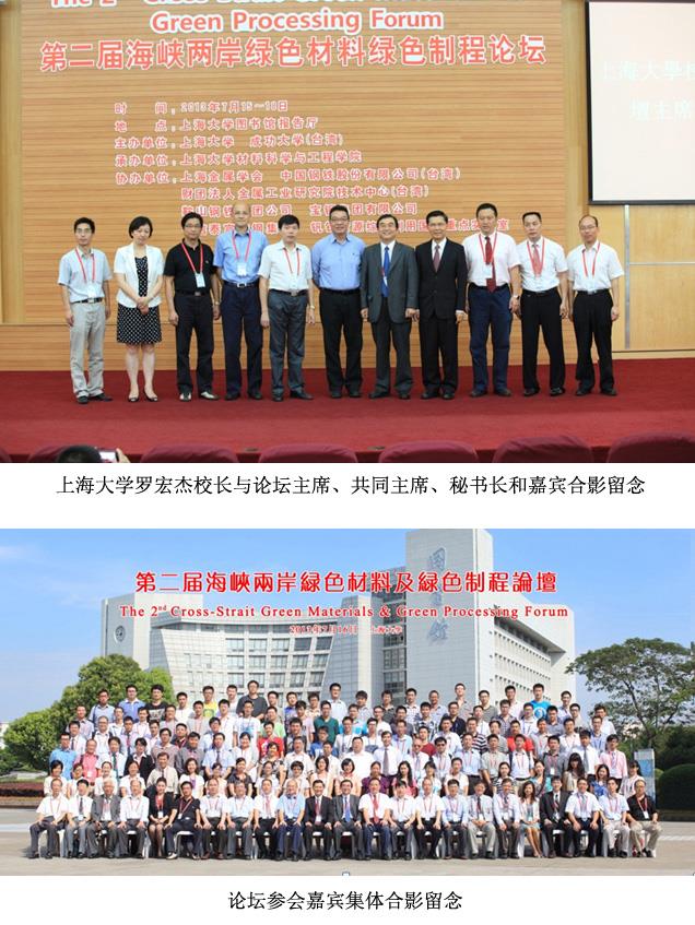 2013年7月15-18日,第二届海峡两岸绿色材料及绿色制程论坛(The Second Cross-Strait Green Materials and Green Processing Forum)在Beat365唯一官方网站顺利召开,此次论坛由Beat365唯一官方网站和成功大学(台湾)联合主办,Beat365唯一官方网站材料科学与工程学院承办,上海市金属学会(大陆)、中国钢铁股份有限公司(台湾)、财团法人金属工业研究发展中心(台湾)、鞍山钢铁集团公司(大陆)、宝钢集团有限公司(大陆)、中信泰富特钢集团(大陆)、钒钛资源综合利用国家重点实验室(大陆)等七家单位协办。此次论坛的主席由Beat365唯一官方网站校长助理翟启杰教授和台湾成功大学研发长黄文星教授担任,执行主席是Beat365唯一官方网站材料学院院长张捷宇教授、材料学院党委书记朱明原教授以及攀钢集团研究院有限公司教授级高工孙朝晖先生。论坛旨在促进海峡两岸材料科学领域的交流与合作,推动海峡两岸绿色材料和先进制备技术的发展。