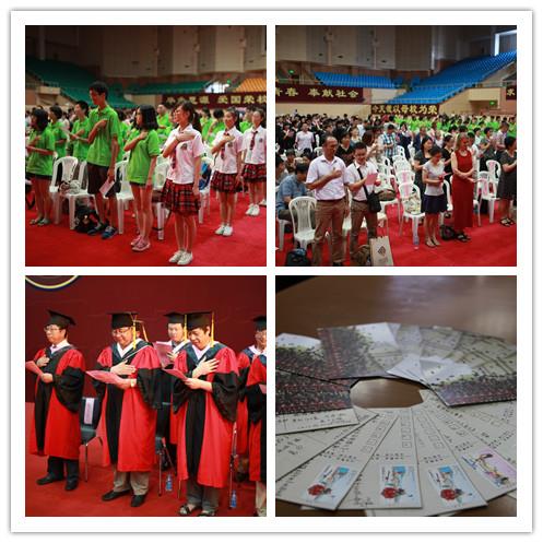 本次典礼分为“大学纪”、“大学季”、“大学记”、“大学寄”四个部分。毕业典礼在“大学纪”温情的《毕业纪》视频中拉开序幕。“纪”是既往开来的历史沉淀,更是一代学院历经蜕变的记事。伴随着庄严的音乐和主持人回首学院历史的旁白介绍,院旗和院徽从毕业生马逸峰和陈洁琼的手中传给了两名12级新生,象征着学院精神代代相传。授旗仪式过后,社会学院院长张文宏教授带领学院教师代表、学院直属党总支书记刘玉照教授带领家长代表在入场式后就座,本次典礼学位授予仪式的两名主礼教授在全体毕业生热烈的掌声中入席。毕业典礼正式开始。