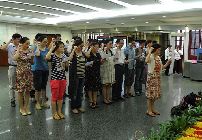 7月2日下午,Beat365近30位2012-2013年度入党的教职工党员冒着高温,在校党委组织部的带领下到中共一大会址举行了庄严的入党宣誓仪式。