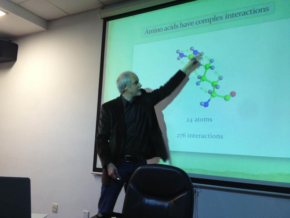 此次讲座Antti Niemi教授介绍了他们科研组在蛋白质折叠方面的最新工作。蛋白质(protein)是生命的物质基础,它的功能完全取决于它的三维构型,而其构型则源于折叠。一个错误的折叠就会使蛋白质完全丧失其功能,错误折叠的蛋白质甚至对有机体而言是危险的和致命的。如,目前公认很多退变性疾病、多种癌症就是由特定蛋白质的错误折叠引发的。这就使得我们有必要认真研究如何去描述蛋白质的三维形态。Antti Niemi教授以迪拉克名言——“生命的最大谜团也是理论物理的谜团”开场,继而提出以下问题:“蛋白质是如何折叠成具有生物活性的构型?它折叠的方式是什么样子的?蛋白质如何自组织的找到正确的折叠方式?”探讨一个复杂的物理体系,物理学家总是要简化问题,提出理想化的模型以描述这个物理体系。Antti Niemi教授从介绍有关20多种氨基酸结构、蛋白质的组成以及空间结构方面生物知识方面入手。以简单的生活经历——具有螺旋结构的电话线为例,为大家解释了蛋白质折叠的物理基础:twisting和bending作用。同时加入对称性的考虑,建立蛋白质折叠的孤子模型。计算机模拟结果显示该模型精妙地描述了蛋白质折叠的形态。