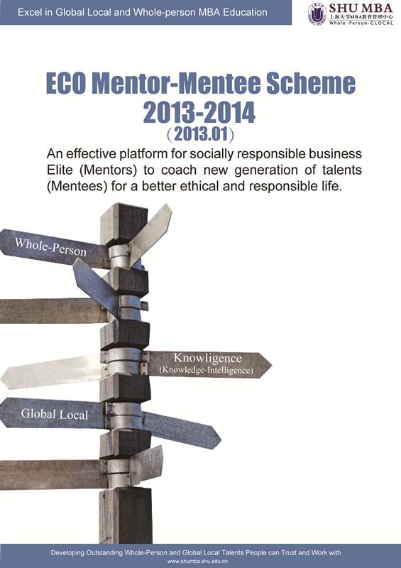 为了让对社会有承担的领袖带领负责任的新一代商业人士,共建更美好、更道德、更负责任的人生,SHUMBA自2004年起多次举办企业导师计划,于2012年首次提出“ECO企业导师”的概念,不断邀请教育界Education、社会社区Community、企业组织Organization的优秀领导者作为导师,在学生与ECO企业导师,学校与社会之间搭建起沟通的桥梁,形成良好的循环,和社会生态环境,生生不息,生机勃然。