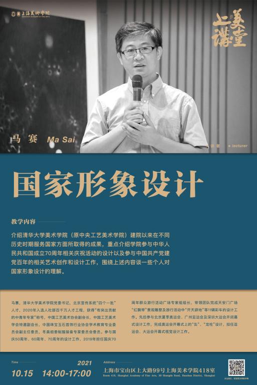 讲座内容:介绍清华大学美术学院(原中央工艺美术学院)建院以来在不同历史时期服务国家方面所取得的成果,重点介绍学院参与中华人民共和国成立70周年相关庆祝活动的设计以及参与中国共产党建党百年的相关艺术创作和设计工作,围绕上述内容谈一些个人对国家形象设计的理解。